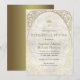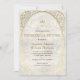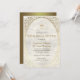 Invitation simple et élégante pour dîner de répétition, avec calligraphie, cadre floral art déco doré sur fond de marbre blanc, monogramme de couronne royale dorée en haut et écriture calligraphique moderne.