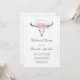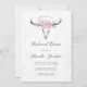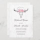 Invitation vos invités de répétition mariage dans le style avec cette invitation à thème rustique. Ce modèle design présente un crâne de vache de porc dessiné à la main avec une robe de tête fleurie rose rousse de roses délicats sur un arrière - plan de bois patiné blanc et gris. Customisez les détails de votre mariage dans un élégant script noir. Le dos de la carte a également une texture de bois imitation pour correspondre. Meilleurs voeux pour votre mariage ! Conçu par l'artiste Susan Coffey.