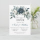 Un mariage sophistiqué avec une couronne florale bleu marine ornée de pivoines verdoyantes, de roses et d'eucalyptus, dans des tons bleu marine, vert et ivoire. Le design est mis en valeur par une boîte imprimée gris argent sous la couronne avec une mise en page de texte de police moderne. Le fond de l'invitation poursuit le thème avec un arrangement floral assorti pour un look cohésif et élégant. Parfait pour les couples à la recherche de papeterie mariage intemporelle et classe.