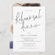 Dîner de répétition Mariage moderne avec invitation photo. Disponible numériquement et imprimé. Ce design moderne dispose d'un élégant script informel pour le dîner de répétition et le reste de la typographie que vous pouvez facilement personnaliser. Vous pouvez également modifier le texte et la couleur de l'arrière - plan si vous le souhaitez via l'option Customiser plus. Remplacez l'exemple de photo au dos par le vôtre.
