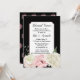 Élégante invitation à la répétition de mariage faite en noir, avec une zone de texte blanc et des accents roses. De magnifiques graphiques de fleurs blanches et roses, décorent le fond de l'invitation. Personnalisez le texte noir pour votre événement mariage.
