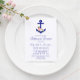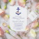 Ancrage nautique bleu conçu avec des fleurs de ranunculus roses et blanches avec une végétation d'eucalyptus pour un événement d'été