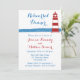 L'invitation présente un phare à rayures rouges et blanches dessiné à la main devant un océan bleu avec un arrière - plan blanc immaculé. Les détails de vos dîners sont imprimés dans un script de coordination et des polices de caractères rouges et bleues faciles à lire.