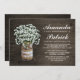 Dîner de répétition Mason Jar Invitations - comprend un arrangement floral de respiration pour bébé à l'intérieur d'un bocal en maçon décoré de burlap, dentelle et ficelle sur un arrière - plan rustique en bois de grange. Voir les produits correspondants dans cette conception via la collection trouvée sur cette page.