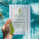 Lancez votre célébration avec style avec cette invitation de dîner de répétition rétro tropiques. Avec des rayures bleues classiques, un ananas joyeux et des feuilles de palmier luxuriantes, ce design allie le charme vintage à une touche tropicale fraîche. Parfait pour les mariages à la plage, de destination ou d'été, il établit un ton décontracté mais élégant pour rassembler les amis et la famille avant le grand jour. Entièrement personnalisable pour correspondre aux détails de votre événement.