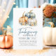 Elégante aquarelle carte d'invitation à dîner d'action de grâce. Bleu turquoise, or orange, blanc avec trois citrouilles et fleurs arrangés. Parfait pour cette saison de vacances d'automne rustique. Invitation votre famille, amis, collègues, voisins, invités...Tout le texte, la couleur et la taille sont modifiables. Consultez la collection "FALL IN LOVE Blue Gold orange citrouilles collection pour d'autres articles.