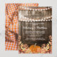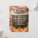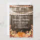 Cartes d'invitation pour une soirée de dîner de Thanksgiving rustique avec un fond de grange campagnarde, tonneau en bois de chêne, guirlande de lumières scintillantes, feuilles d'automne, une citrouille de récolte et un modèle pour dire merci facile à personnaliser.
