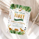Cette adorable invitation à l'anniversaire présente des feuilles d'aquarelle tropicale ornés d'ornements en feuille d'or et de silhouettes de dinosaures dorées.