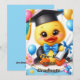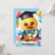 Cette adorable illustration numérique représente un caneton jaune joyeux vêtu d'une robe de remise de diplôme noire, d'un nœud papillon bleu et d'un classique chapeau de graduation noir avec un gland doré. Le caneton tient un diplôme enroulé attaché avec un ruban rose, symbolisant un moment de joie marquant. L'arrière-plan est décoré avec de beaux ballons colorés, des fanions festifs, des confettis et une boîte cadeau emballée, créant une atmosphère vibrante et festive. Un petit canard en caoutchouc est assis parmi les confettis, ajoutant une touche supplémentaire de mignonnerie à la scène.