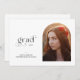 Cette faire-part moderne de graduation en noir et blanc présente une typographie branchée et une photo en arc. Sur le devant, le mot "grad" est écrit en un type unique avec l'année de graduation ci-dessous. En bas, ajoutez le nom et l'école du diplômé. La typographie est noire contre un arrière - plan blanc chic. A droite de la typographie, une photo en arc est affichée. Au fond, il y a un modèle pour les détails de la fête de remise des diplômes.