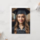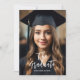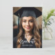 Photo sur mesure d'un diplômé avec typographie en écriture blanche. Invitation de célébration de graduation personnalisable en typographie noir et or.