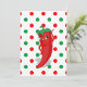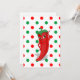Un personnage de dessin animé de piment rouge et chaud. Version à pois rouge et vert. Idée cadeau pour les personnes qui aiment les piments et les plats épicés ! Dos blanc pour les messages manuscrits.