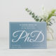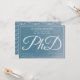 Une invitation à la fête de doctorat en bleu et blanc. Cette invitation a également un motif du mot PhD, en écriture, au dos. L'invitation est réglée sur un papier plus brillant pour effet.