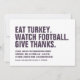 Mangez de la dinde, regardez le football, merci. Conçue pour coordonner avec la collection Lea Delaveris Design moderne Give Thanks, cette invitation Thanksgiving avec un texte en prune violet audacieux peut être modifiée pour répondre à votre propre sens de l'humour ou du style. Il est également disponible en téléchargement numérique d'invitation Thanksgiving.