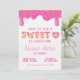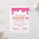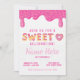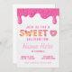 Un arrière - plan blanc présente le mot "SWEET" en grandes lettres majuscules stylisées. Les lettres sont formées d'un beige clair ou d'un beige doré, avec une couche de glace rose qui s'écoule au-dessus des lettres et une abondance d'arroses multicolores. Le givrage rose goutte vers le bas du bord supérieur de l'image, également couvert d'arrosages. Une partie d'une beigne vitrée rose, avec un trou en forme de coeur, est placée à droite et légèrement en dessous du mot. La texture arrière - plan semble être un blanc légèrement texturé et lisse. Disponible en invitations imprimables et téléchargements instantanés.