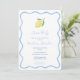 Un baby shower d'agrumes frais et simple, avec une frise blanche dessinée à la main et un seul citron. Au verso, un motif à rayures fines bleues et blanches, donne un clin d'oeil à la Riviera italienne.