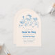 Cette charmante invitation à la douche nuptiale bleue et crème est basée sur la tendance populaire dessinée à la main qui propose des plats et des boissons de style français ou italien dans un style fantaisiste, doodle, gribouillant. Ce design est idéal pour un brunch ou une fête de thé. Il présente des illustrations dessinées à la main d'un vase de fleurs, de gâteau, de tasse à thé, de théière, de croissants, de fraises, de couteau et de fourchette, et porte-bougie. Cette invitation vient standard en forme d'arc découpe, mais vous pouvez aussi la changer en d'autres formes.