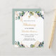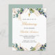 Un arrière - plan blanc décoré de verdure d'eucalyptus et de feuilles dorés. Personnalisez et le nom de l'enfant et les détails de la cérémonie. Lettres noires et dorées. Retour : arrière - plan vert