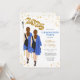 Twins double Graduation Party Invitation. Les jumelles jumelles double graduation combinent fête de remise des diplômes. Portrait de femmes jumelles aux cheveux rouges clairs en robes noires avec des robes de graduation bleues et des casquettes de graduation avec des ballons d'or pour la classe de 2025. Les deux jumeaux sont au dos de la carte avec leurs photos, noms, écoles et diplômes.