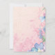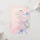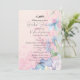 Une invitation de fête de mariage élégante et féminine. Le fond est une illustration aquarelle douce et délicate d'un arrangement floral avec de jolies fleurs sauvages roses et bleues sur un fond de parchemin pêche qui donne à ce design une touche romantique. Des fleurs bleues ornent le bord du design tandis que les fleurs roses se fondent dans le fond pour un effet doux et délicat.