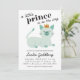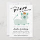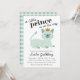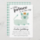 Cartons d'invitation de fête de naissance avec une adorable illustration d'un chat prince vert menthe. Le chaton porte une couronne et est allongé avec un sourire sur son visage. Le texte au-dessus de l'illustration dit "un petit prince est en route". Les informations sur la fête de naissance sont sous le chat. Les textes sont facilement modifiables en ligne. Illustration et conception originales de Namibear Art Studio.©Namibear