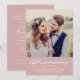 Annoncez votre mariage avec une douce chaleur et invitez vos proches à votre réception de mariage avec cette invitation photo calligraphiée rose. Une bannière rose douce présente "Annonce" en écriture blanche fluide avec les noms, la date et le lieu de la cérémonie. Le verso fournit tous les détails de la réception, y compris le lieu, l'heure et les informations de RSVP. Ajoutez votre propre photo et personnalisez chaque élément de texte.