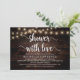 Calligraphie moderne Carte d'invitation de douche nuptiale (Douche avec Amour), en bois foncé rustique lampes à cordes design thème. Invitation les invités avec cette carte d'invitation parfaite. Ajoutez les détails de votre douche nuptiale dans le libellé correspondant.