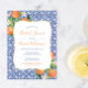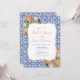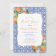 Cartes d'invitation pour douche de mariée avec oranges aquarelles / carreaux bleus azulejo.