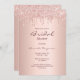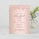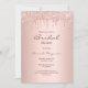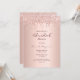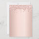 A l'avant : Un faux arrière - plan rose en or. Décoré avec de l'or rose, des gouttes roses, l'air de la goutte de peinture. Modèles pour le nom de la mariée et les détails du parti. Le nom et le texte : Mariée sont écrits avec un script de style écrit main, des lettres de couleur noire. Retour : arrière - plan rose en or avec fausse parties scintillant goutte à goutte.