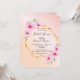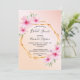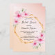 Une élégante invitation à la nuptiale tropicale estivale. Avec un cadre géométrique en faux or décoré d'hibiscus rose pâle, fleurissent des fleurs tropicales avec un peu de verdure. Un arrière - plan rose or et rose vif dégradé. Le nom de la mariée à être est écrit avec un script de style manuel moderne. Texte noir. Dos : Un arrière - plan rose doré et rose pâle.