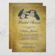 Invitation nuptiale rustique de douche de paon. © de BlissfulWedding chez Zazzle. Ces invitations magnifiques sont parfaites pour une douche nuptiale orientée de paon vintage. Deux beaux paons sur la bannière vintage et texte dans une police bleu-foncé tous sur un arrière - plan de papier vintage thé-souillé imprimé (effet affligé de photo de regard), créent une invitation nuptiale romantique unique et élégante de douche. Autre colore disponible.