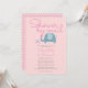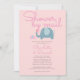 Une charmante invitation avec des parents et des bébés éléphants mignons avec des cœurs et des détails personnalisés de douche pour bébé à distance, de sprinkle ou de douche de couple par courrier sur un fond rose bébé. Le verso présente un motif de pois roses sur un fond rose bébé. Conçu par Thisisnotme©