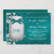Un superbe aqua bleu turquoise vert et turquoise en forme de bocal de luciole à l'effigie d'une cabane de luciole à l'invitation wedding shower qui semble briller. Ajoutez les initiales et ou le monogramme de la mariée et du marié dans le bocal avec un motif imprimé en ruban bleu et blanc profond. Une subtile bordure en dentelle antique damassée vintage complète ce design rustique mais élégant avec des lucioles enchanteresses à l'intérieur et à l'extérieur du bocal. Ces invitations sont magnifiques pour une soirée nocturne, un baryton, une douche à thème de campagne ou une fête de fiançailles. Oeuvre © Chrissy H. Studios, LLC.Tous droits réservés.