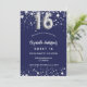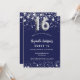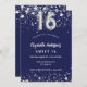 Une invitation moderne, élégante et glamour pour une fête Sweet 16, 16e anniversaire. Un arrière - plan bleu marine, décoré de faux étoiles argentées. Personnalisez et ajoutez votre nom et les détails de votre fête. Le numéro 16 est écrit avec une police de style ballon.