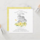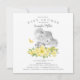 Adorable éléphant joyeux avec de jolies fleurs jaunes pour un baby shower neutre pour les deux sexes. Retournez notre invitation pour voir un retour de coordination pour une touche spéciale supplémentaire.