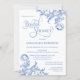 © Socialite Designs Inc. Beau coin tourbillonne et fleurit l'invitation à la douche nuptiale, peinte en couleur bleu bleu doux. Une élégante invitation pour toute période de célébration de l'année. Si vous avez besoin d'aide pour customiser ou souhaitez d'autres produits créés avec ce design, n'hésitez pas à contacter Socialite Designs.