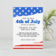 Cette invitation de fête personnalisée présente un thème patriotique de la fête du 4 juillet. Les bordures supérieure et inférieure présentent le motif du drapeau américain. Une bannière d'étoiles blanches sur un fond de style pailleté bleu est placée le long du haut. Une bannière de bandes pailletées blanches et rouges est placée le long du bas. Le titre de la fête "4 juillet" est imprimé au centre dans une grande police bleue, suivi des informations sur l'événement.