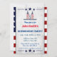Vous cherchez des invitations à la retraite pour une personne de l'armée de l'air navale? Découvrez cette option classe avec le qui vous pouvez customiser avec les détails de votre propre fête. avec le drapeau américain dans l'arrière - plan, Le thème de couleur est rouge, blanc et bleu, Catégorie : cartes militaires de retraite enrôlées et invitations de fête avec étoiles et rayures / thème USA.
