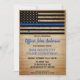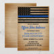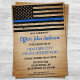 Cartes d'invitation pour la retraite de la police Thin Blue Line ou invitations pour la cérémonie de remise des diplômes de la police. Célébrez des années de service dévoué ou célébrez votre nouveau diplômé de l'académie de police et invitez vos amis et votre famille à votre fête d'application de la loi avec cette invitation de retraite de la police rustique en bois avec le drapeau Thin Blue Line et les invitations pour la cérémonie de remise des diplômes de l'académie de police - design de drapeau américain dans les couleurs du drapeau de la police, design en détresse. Cette invitation de retraite pour policier est également parfaite pour les invitations de remise des diplômes de l'académie de police, possibilité de modifier le lieu lors de la personnalisation. Consultez notre collection pour des cadeaux de retraite pour policiers, des cadeaux de remise de diplôme de la police, des faveurs de fête et des