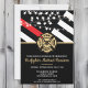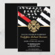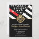 Ce design présente un drapeau de pompiers avec des bandes noires et blanches, ainsi qu'une fine bande rouge. Un badge de pompier est situé au-dessus de tous les détails de la fête pour le pompier diplômé. Ce design fonctionne également très bien pour une fête de retraite d'un pompier, d'un lieutenant ou d'un chef.