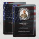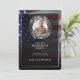 Photo personnelle décorée de feuilles de laurier argentées et d'un cadre argenté sur un glorieux drapeau américain flottant sur un fond noir. Un modèle de fête de retraite élégant avec photo facile à éditer. Ce design luxueux convient aux vétérans, aux militaires, à la police, aux emplois liés au gouvernement ou aux emplois liés au patriotisme.