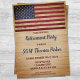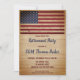 Cartes d'invitation rustiques pour fête de retraite militaire avec drapeau américain. Ces invitations de fête avec drapeau américain rustique sont parfaites pour les retraites militaires, les fêtes d'adieu pour les soldats, les départs en déploiement militaire, les célébrations de retour au pays, et les remises de diplômes militaires. Personnalisez cette invitation avec drapeau américain avec l'événement de votre soldat, son nom et les détails de la fête.