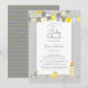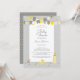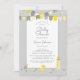 La conception de la célébration de la baby shower colorée et neutre en gris et jaune présente une calligraphie et un script tendance en gris disposés dans une bordure amusante entourée de banderoles de drapeaux coordonnés et de confettis. Au bas de la conception, vous trouverez plus de confettis ainsi qu'un biberon, un canard en caoutchouc, une tétine et des épingles à langer. Pour de meilleurs résultats, suivez les instructions du modèle et l'espacement lors de la saisie de vos informations. Le dos de la carte est un motif à pois jaunes sur un fond gris tendance et correspond à l'un des drapeaux de la banderole. Envoyez un e-mail à invitationsuites@gmail.com pour toute question ou demande personnalisée.