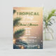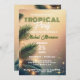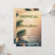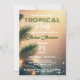 Cette invitation à la fête tropicale personnalisable dégage un style graphique dynamique et élégant. Dans un décor de soleil doré et chaleureux aux effets bokeh, des feuilles de palmiers verts luxuriants ornent le sommet, décorant le thème tropical. Le texte est entièrement personnalisable. Parfait pour des anniversaires jalons ou toute célébration à thème tropical !