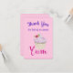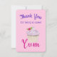 Un carte de remerciements conçu avec l'illustration d'un cupcake délicieux avec des tourbillons roses et une baie avec des feuilles nichés dans le gel. Yum ! écrit en rose chaud avec une police tendance fantaisie. Placez-vous sur un arrière - plan rose pâle.