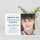 Célébrez les réalisations de votre diplômé avec vos amis et votre famille à distance de sécurité avec un entraînement de la fête de remise de diplômes! Le devant de cet invitation simple présente sa photo préférée d'un côté (l'orientation verticale est la meilleure), une typographie moderne bleu foncé et noir et des détails de la fête facilement customisés, y compris où et quand conduire, déposer cadeau et traiter les zones, les précautions de sécurité, s'il ou elle ouvrira le cadeau pendant la fête ou d'accueillir un facebook live, instagram ou autre événement en ligne pour déenvelopper les cadeaux et où obtenir plus d'informations. Au verso de l'invitation, vous pouvez ajouter ses informations scolaires et l'année de classe sous l'illustration d'un plafond de remise de diplômes.