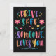 Warm reminder message with colorful hand lettering on a dark background. A gentle and emotional phrase that encourages safe driving and shows care, love, and connection for family, friends, and loved ones.