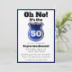 Cette invitation personnalisée présente un drôle de thème d'anniversaire d'officier de police pour une fête de 50e anniversaire. Une image d'un badge de flic bleu et or brillant est imprimée au centre avec l'année d'anniversaire "50" imprimée sur elle en référence au terme cinq-o argot pour les policiers. On peut lire le message d'accueil comme "Oh non, c'est le cinq-o."