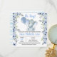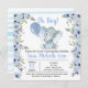 baby shower d'aquarelle pour garçons Cette invitation de baby shower d'éléphant d'aquarelle pour garçons présente un joli éléphant avec quelques fleurs d'aquarelle bleue sur un arrière - plan blanc. Idéal pour un baby shower à thème d'éléphant de garçon à venir.