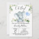 Invitation de Baby shower d'aquarelle pour éléphants de garçon L'invitation de baby shower d'éléphant d'aquarelle de garçon comporte un joli éléphant, un ballon bleu bébé et un feuillage vert sur un arrière - plan blanc. Idéal pour un baby shower à thème d'éléphant de garçon à venir.